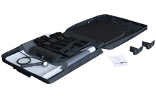 Deluxe carrying case incorporates detachable wheels for enhanced portability and doubles as a padded treatment surface for added comfort